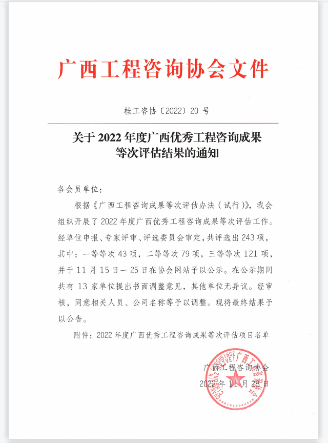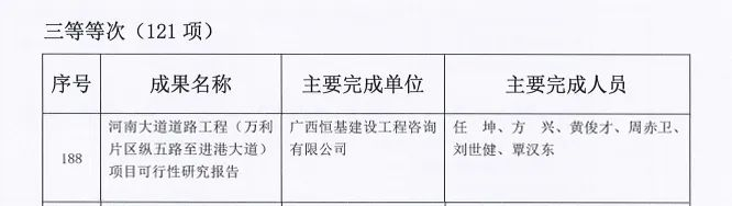 近日,2022年度廣西優(yōu)秀工程咨詢成果獎(jiǎng)獲獎(jiǎng)項(xiàng)目名單揭曉。經(jīng)協(xié)會(huì)專家評(píng)審,評(píng)選委員會(huì)審定,廣西恒基建設(shè)工程咨詢有限公司參與的《河南大道道路工程(萬(wàn)利片區(qū)縱五路至進(jìn)港大道)項(xiàng)目可行性研究報(bào)告》榮獲2022年度廣西優(yōu)秀工程咨詢成果獎(jiǎng)三等獎(jiǎng)。