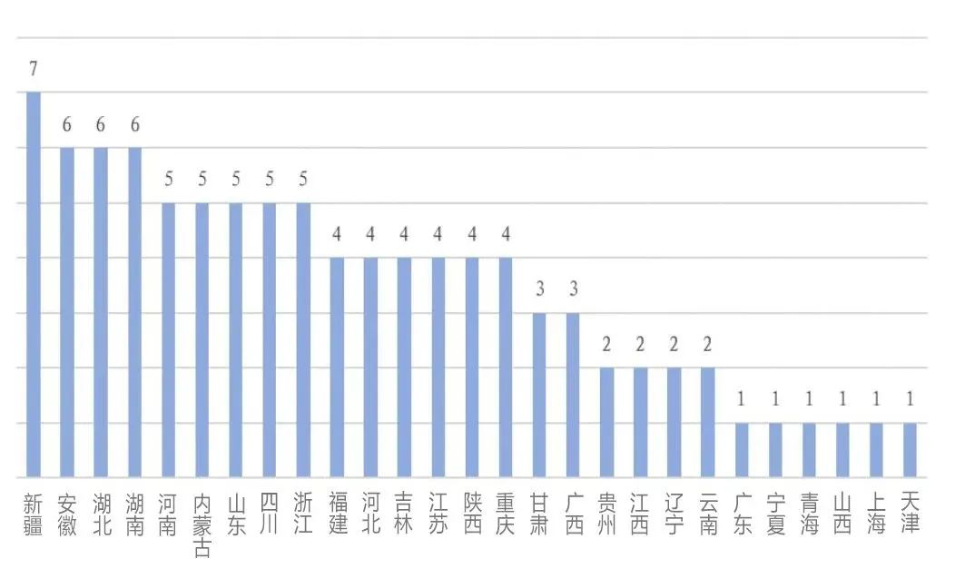 從地區(qū)分布看,27個(gè)省/直轄市申報(bào)了試點(diǎn)項(xiàng)目,其中,華東地區(qū)試點(diǎn)項(xiàng)目數(shù)量最多,涉及27個(gè)項(xiàng)目,占比28.72%;西北地區(qū)涉及16個(gè)項(xiàng)目,占比17.02%;西南地區(qū)涉及13個(gè)項(xiàng)目,占比13.83%;華北和華中地區(qū)均涉及11個(gè)項(xiàng)目,占比11.7%;華南地區(qū)涉及10個(gè)項(xiàng)目,占比10.64%;最后是東北地區(qū),涉及6個(gè)項(xiàng)目,占比6.38%。具體各省/直轄市數(shù)量分布如圖1-1所示。