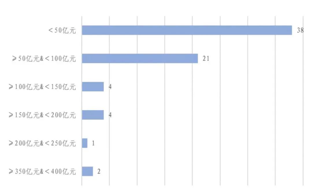 通過對(duì)兩批94個(gè)EOD試點(diǎn)項(xiàng)目公開資料的查閱,目前已知投資額度的項(xiàng)目有70個(gè),總投資額為4420.17億元。投資額在50億元以下和50億元以上,100億元以下的項(xiàng)目數(shù)量分布較多,共計(jì)59個(gè),占已調(diào)查項(xiàng)目的85.13%,其中,“韶關(guān)市曲江區(qū)生態(tài)環(huán)境導(dǎo)向的煤矸石綜合利用項(xiàng)目”投資額最小,為3億元;而投資額在200億元以上的項(xiàng)目僅有3個(gè),分別是:“重慶市經(jīng)濟(jì)開發(fā)區(qū)生態(tài)環(huán)境導(dǎo)向的開發(fā)項(xiàng)目”(390億元)、“涪江遂寧主城區(qū)段環(huán)境綜合整治與城鄉(xiāng)一體化融合開發(fā)項(xiàng)目”(368億元)和“莆田市木蘭溪綬溪片區(qū)生態(tài)環(huán)境導(dǎo)向的開發(fā)項(xiàng)目”(210億元)。