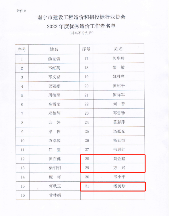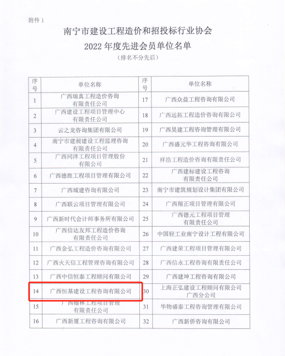 近日,南寧市建設(shè)工程造價(jià)和招投標(biāo)行業(yè)協(xié)會(huì)公布2022年度先進(jìn)會(huì)員單位和優(yōu)秀造價(jià)工作者名單,廣西恒基建設(shè)工程咨詢有限公司成功獲評(píng)協(xié)會(huì)“2022年度先進(jìn)會(huì)員單位”,公司黃金鑫、方興、潘美珍3人獲評(píng)協(xié)會(huì)“2022年度優(yōu)秀造價(jià)工作者”。
