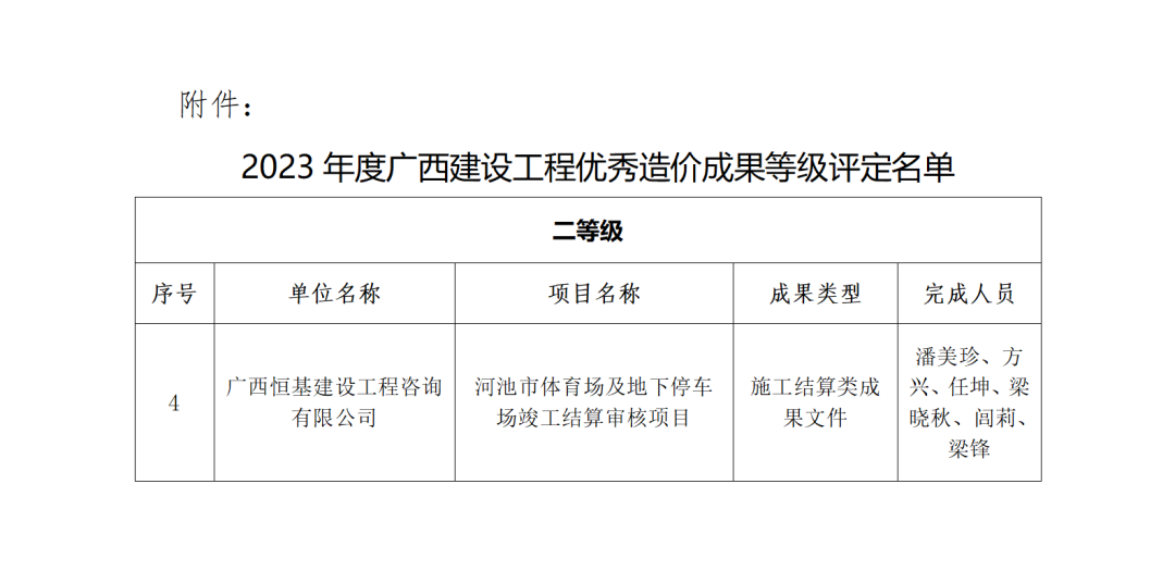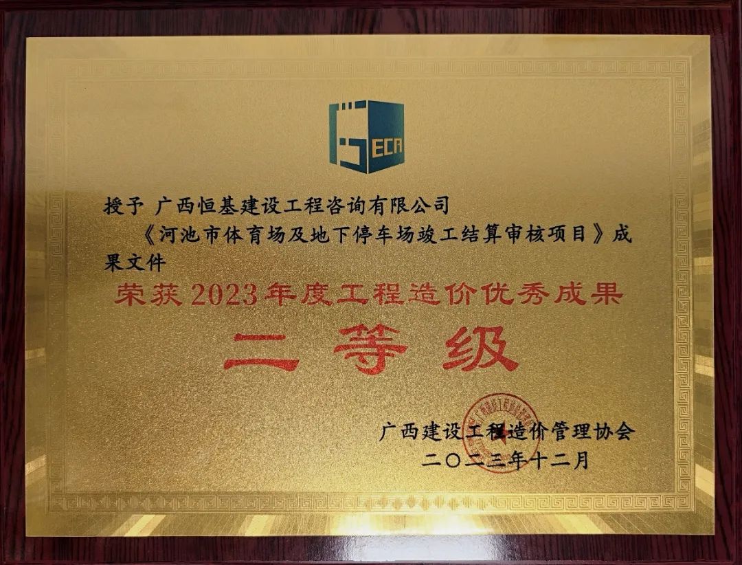 近日,廣西建設(shè)工程造價(jià)管理協(xié)會(huì)召開第五屆第五次理事會(huì)暨第三次會(huì)員代表大會(huì),會(huì)上頒發(fā)2023年度優(yōu)秀工程造價(jià)成果等級(jí)評(píng)定證書,恒基咨詢《河池市體育場(chǎng)及地下停車場(chǎng)竣工結(jié)算審核項(xiàng)目》成果文件榮獲2023年度工程造價(jià)優(yōu)秀成果二等級(jí)。