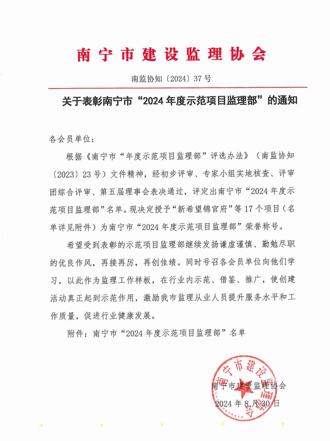 8月30日,南寧市建設監(jiān)理協(xié)會公布了“2024年度示范項目監(jiān)理部”評選結(jié)果,恒基咨詢監(jiān)理的南寧市友愛南路13號小區(qū)危舊房改住房改造項目脫穎而出,成功入選。