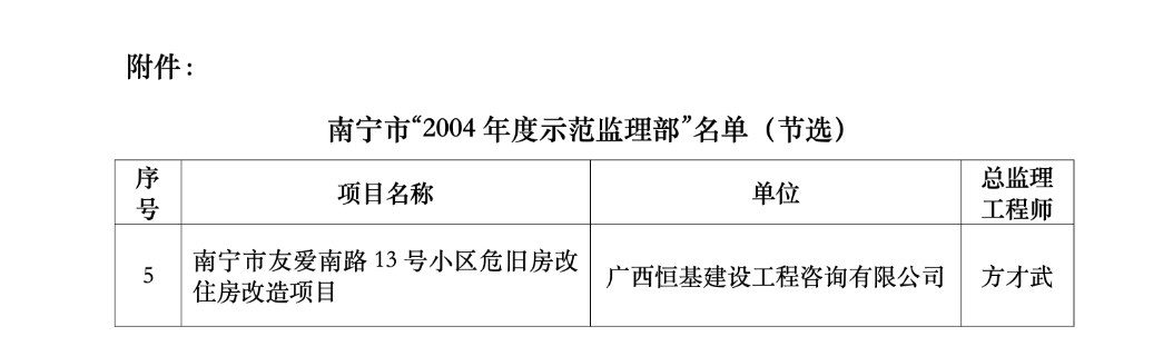 項目名稱:南寧市友愛南路13號小區(qū)危舊房改住房改造項目 項目總監(jiān):方才武 恒基咨詢監(jiān)理團隊在項目建設過程中,嚴格按照國家相關(guān)法律法規(guī)及行業(yè)標準,以高度的專業(yè)素養(yǎng)和責任心,對工程質(zhì)量、安全、進度等關(guān)鍵環(huán)節(jié)進行了全面、精準的把控。通過科學有效的監(jiān)理措施和嚴謹細致的工作態(tài)度,確保了改造項目的順利進行,并有效提升了工程品質(zhì)。 下一步,恒基咨詢將以此次獲獎為契機,繼續(xù)秉承“專業(yè)、高效、誠信、服務”的企業(yè)理念,為南寧市城市建設和發(fā)展貢獻更大力量。