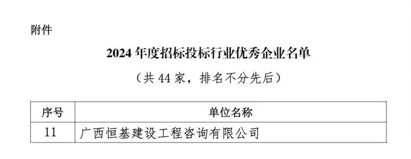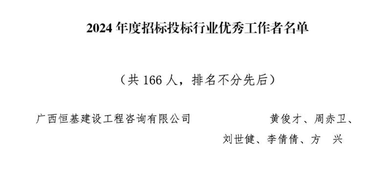 2025年9月22日,廣西建筑業(yè)聯(lián)合會(huì)公布了2024年度招標(biāo)投標(biāo)行業(yè)優(yōu)秀企業(yè)和優(yōu)秀工作者名單,廣西恒基建設(shè)工程咨詢(xún)有限公司憑借卓越的專(zhuān)業(yè)能力和優(yōu)質(zhì)的服務(wù),成功榮獲2024年度招標(biāo)投標(biāo)行業(yè)優(yōu)秀企業(yè)稱(chēng)號(hào),多名員工同時(shí)榮獲招標(biāo)投標(biāo)行業(yè)優(yōu)秀工作者稱(chēng)號(hào)。