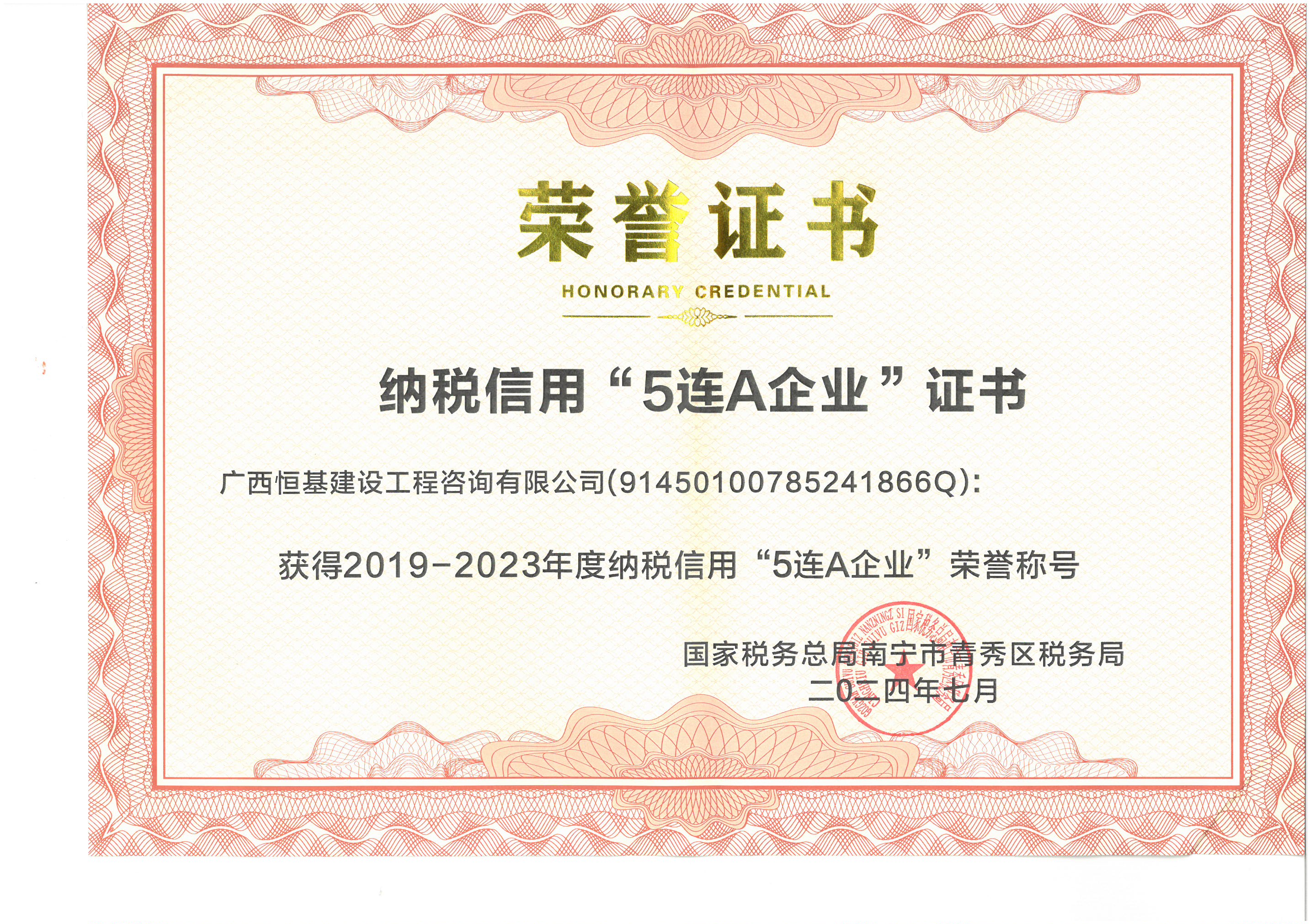 2019-2023年度納稅信用“5連A”企業(yè)證書
