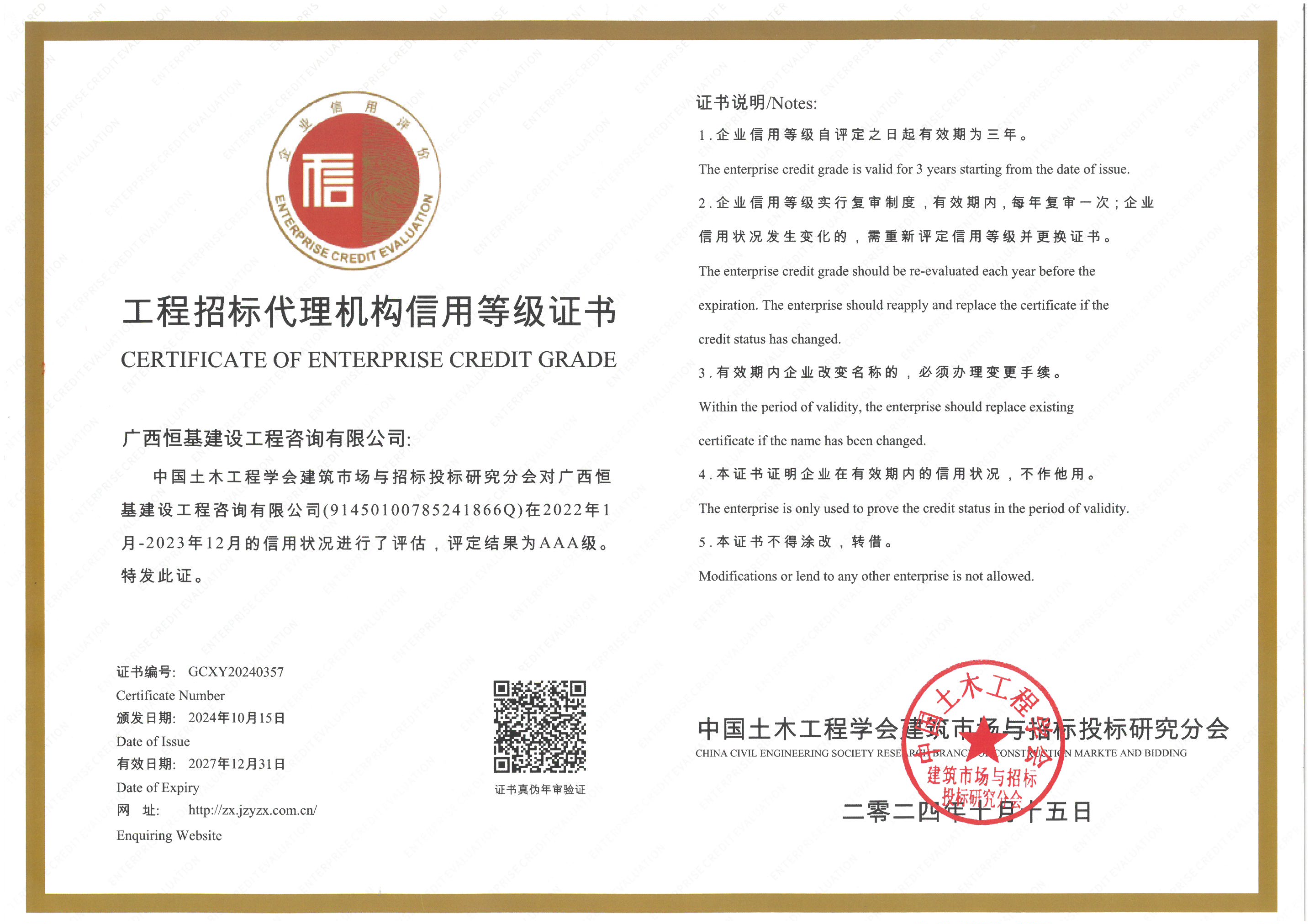 工程招標(biāo)代理機(jī)構(gòu)信用等級證書AAA級(有效期至2027.12.31)