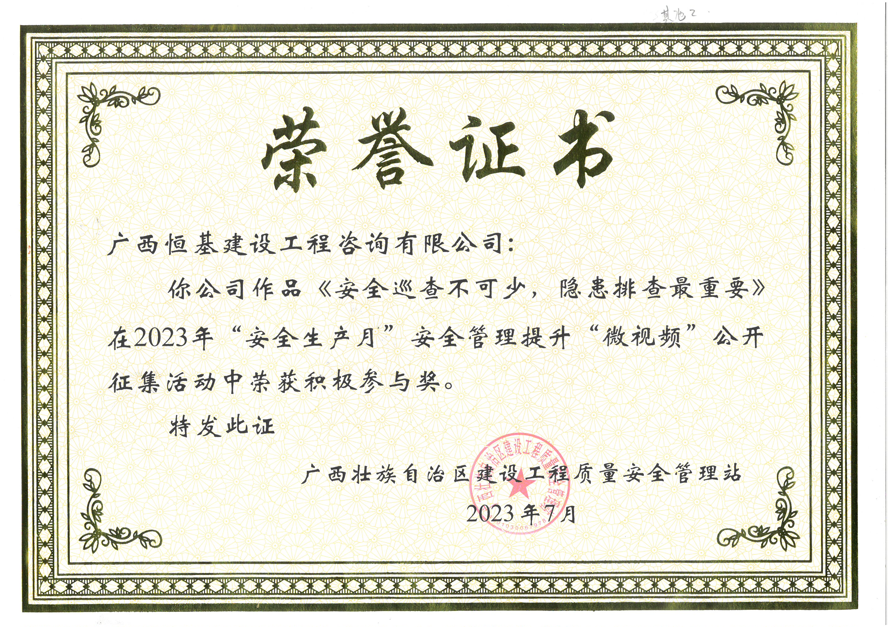 《安全巡查不可少,隱患排查最重要》獲2023年“安全生產(chǎn)月”安全管理提升“微視頻”公開征集活動(dòng)積極參與獎(jiǎng)