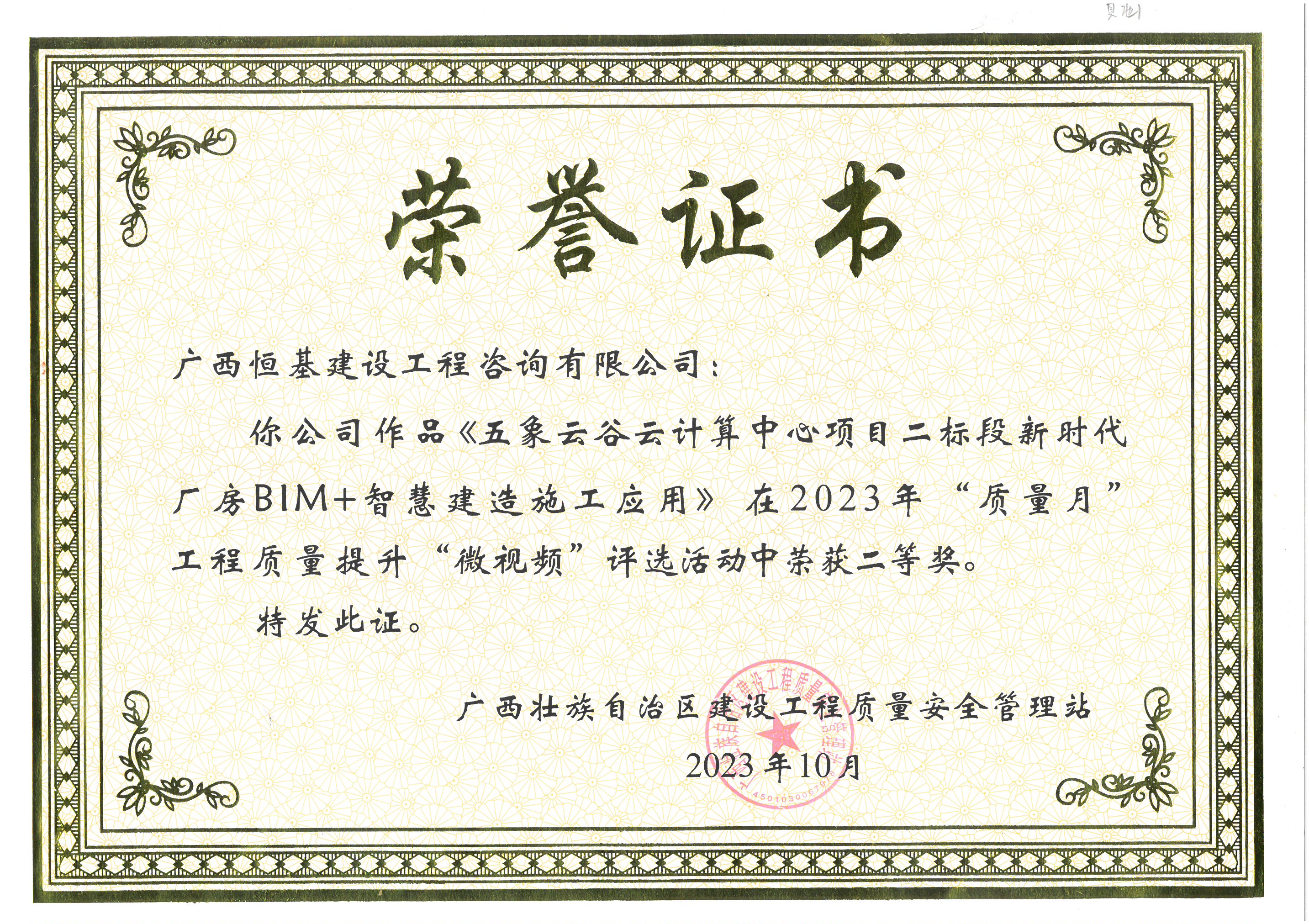《五象云谷云計(jì)算中心項(xiàng)目二標(biāo)段新時(shí)代廠房BIM+智慧建造施工應(yīng)用》獲2023年“質(zhì)量月”工程質(zhì)量提升“微視頻”評(píng)選活動(dòng)二等獎(jiǎng)