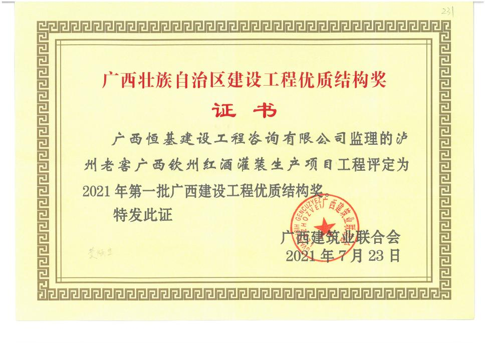 瀘州老窖廣西欽州紅酒灌裝生產(chǎn)項(xiàng)目工程——2021年第一批廣西建設(shè)工程優(yōu)質(zhì)結(jié)構(gòu)獎