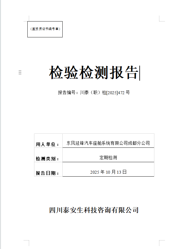 東風延鋒汽車座艙系統(tǒng)有限公司成都分公司—川泰(職)檢[2025]472號